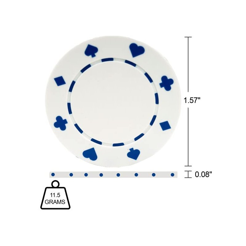 - PRODUCT DETAILS – Materials: Composite Resin. Dimensions: 39mm Diameter; Weight: 11.5-grams each. Includes 100 Casino Chips. Color: White and Blue.