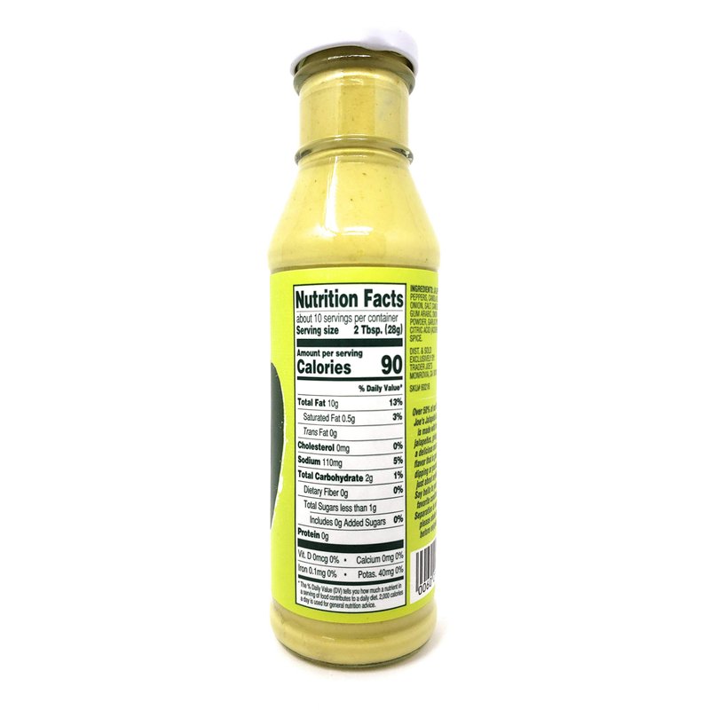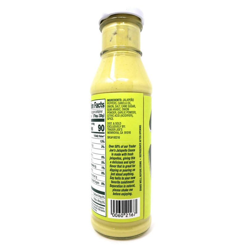- Over 50% of our Trader Joe's Jalapeno Sauce is made with fresh jalapenos, giving this a delicious and spicy flavor that is great for dipping or pouring on just about anything.