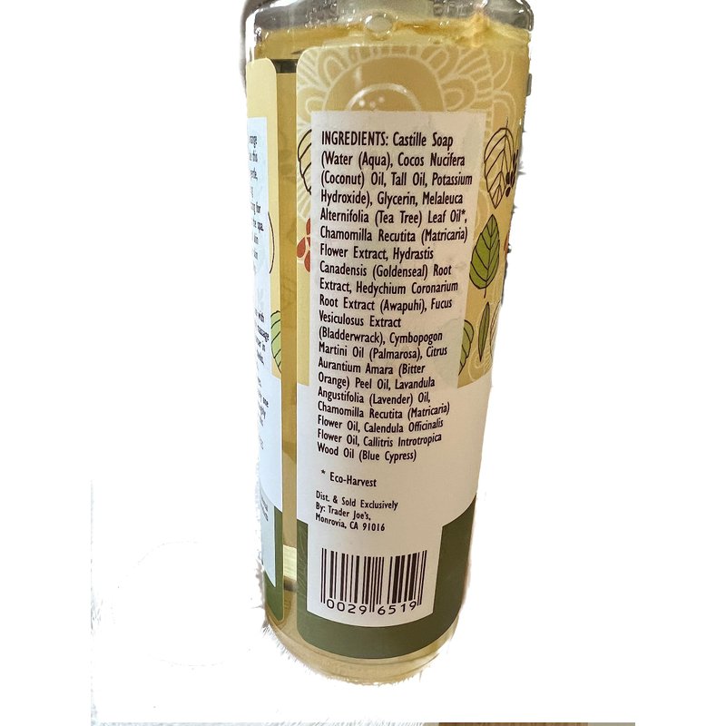 8.5 FL OZ Trader Joe's Spa face wash with Tea Tee Oil. Contains Tea tree oil, awapuhi, orange peel and lavender - Makes this face wash strong yet gentle, refreshing without being astringent, as rejuvenating for your skin as a day at the spa. It soothingly cleans all skin types and leaves your skin feeling smooth and silky.