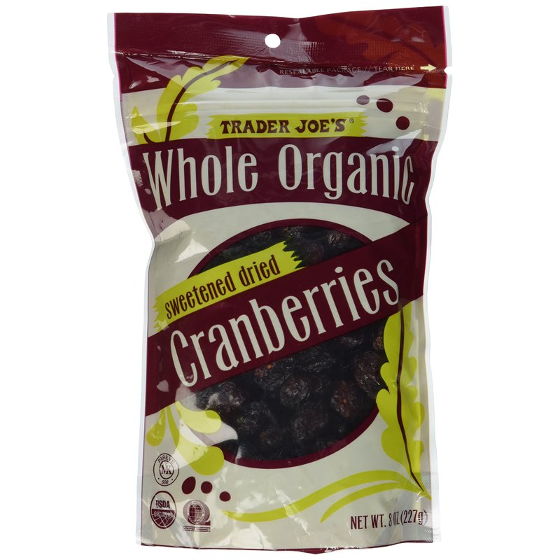 Trader Joe's Whole Organic sweetened dried cranberries are moist and flavorful, plump, whole and juicy, bursting with flavor. To balance out the berries tart nature, we've added organic sugar. The result is a delicious desirous delight that makes a great snack, cereal topper or salad addition.