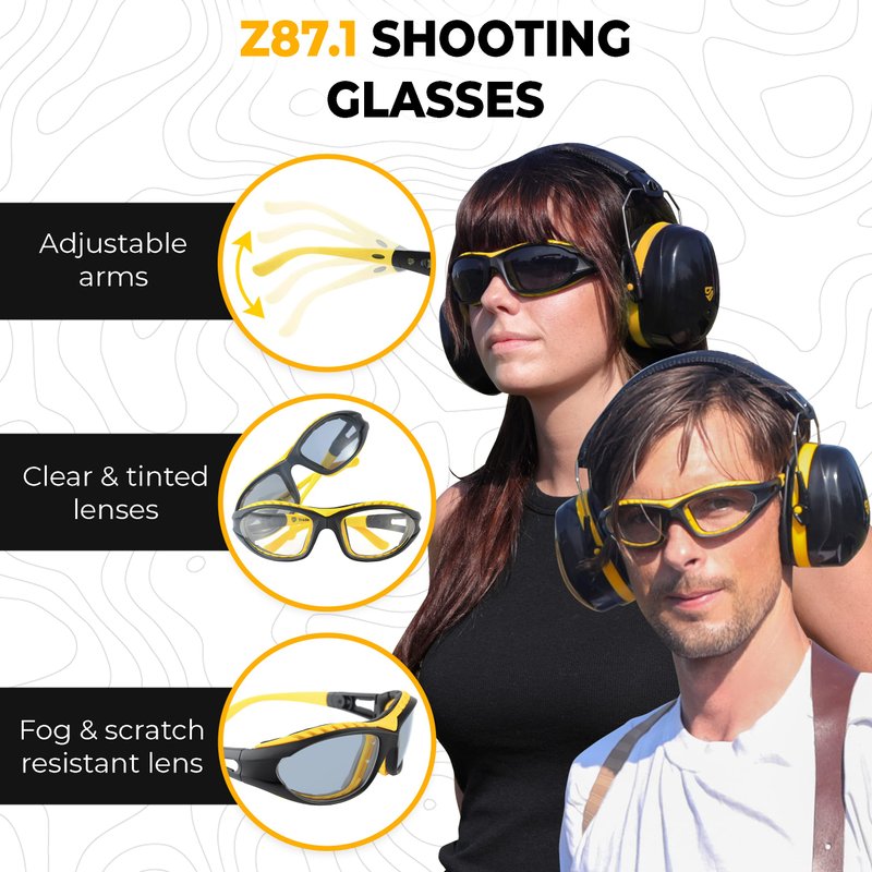 - BUY NOW AND GET: 1x shooting headphones, 1x clear shooting range glasses, 1x tinted shooting range glasses, 1x microfiber pouch, 5x pairs of NRR 33 disposable earplugs, and 1x universal hard carrying case that stores shooting ear protection muffs and two pairs of shooting glasses. Microfiber pouch material cleans lenses without damaging the anti-fog coating! ANSI certified in the U.S. in 2021.