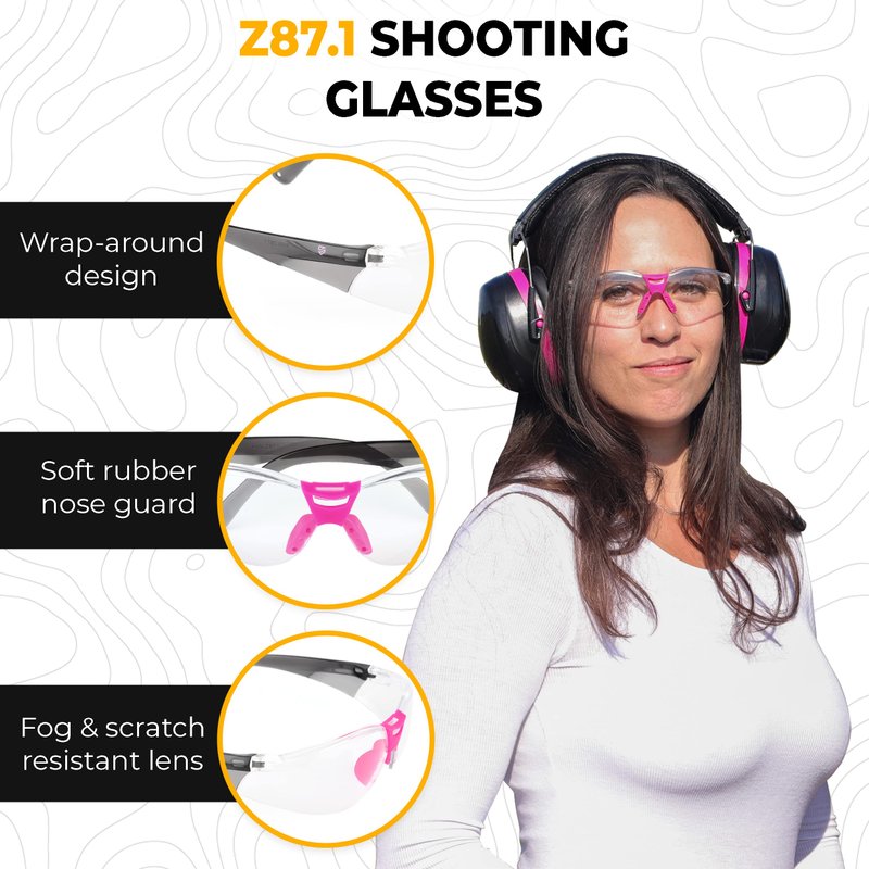 - DISCOVER INSIDE: Get 1x NRR 28 earmuffs for shooting range and 1x clear shooting eye protection glasses, harmoniously color-matched for a unique and stylish look. Plus, an included 1x microfiber pouch for your shooting glasses. Insider tip: This pouch doubles as a lens cleaner! Preserve the anti-fog magic of your shooting eye protection by skipping alcohol or common lens cleaners. All confidently secured with a 10-year hassle-free warranty. ANSI certified in the U.S. in 2021.