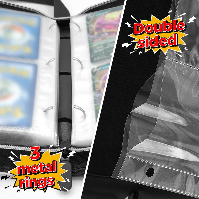 - Organise & display - This card collection binder features 50 acid-free, 9 pocket high transparency double-sided removable pages, along with 900 card sleeves. 3 metal ring design makes it easy to organize, switch, or add pages as needed. This versatile trading card storage is not only an excellent storage solution for trading cards with its portable design and integrated cartable holder, but it also makes for an ideal gift that will delight both boys and girls alike.
