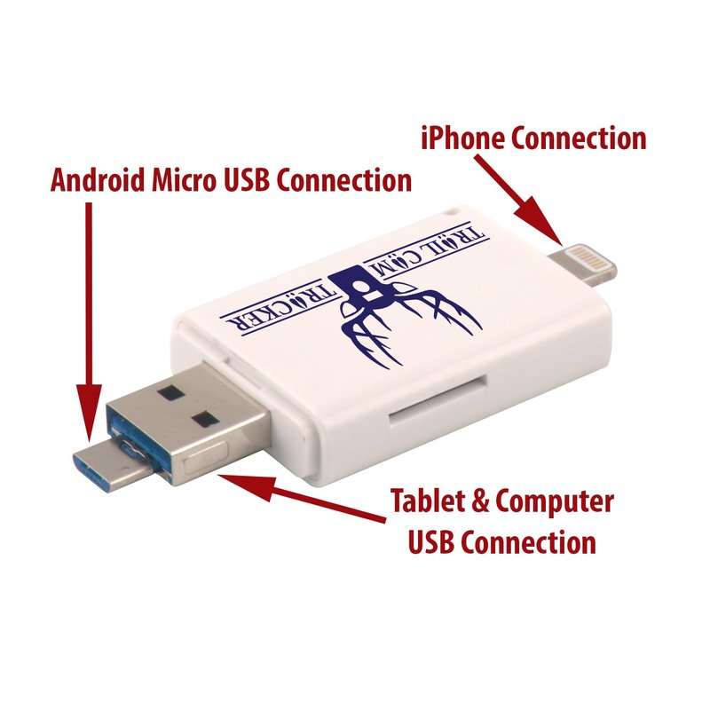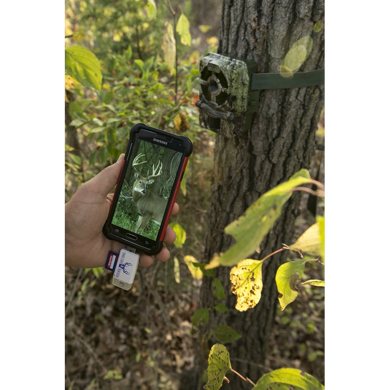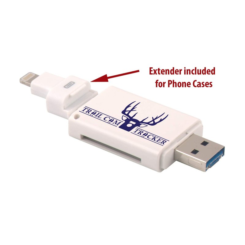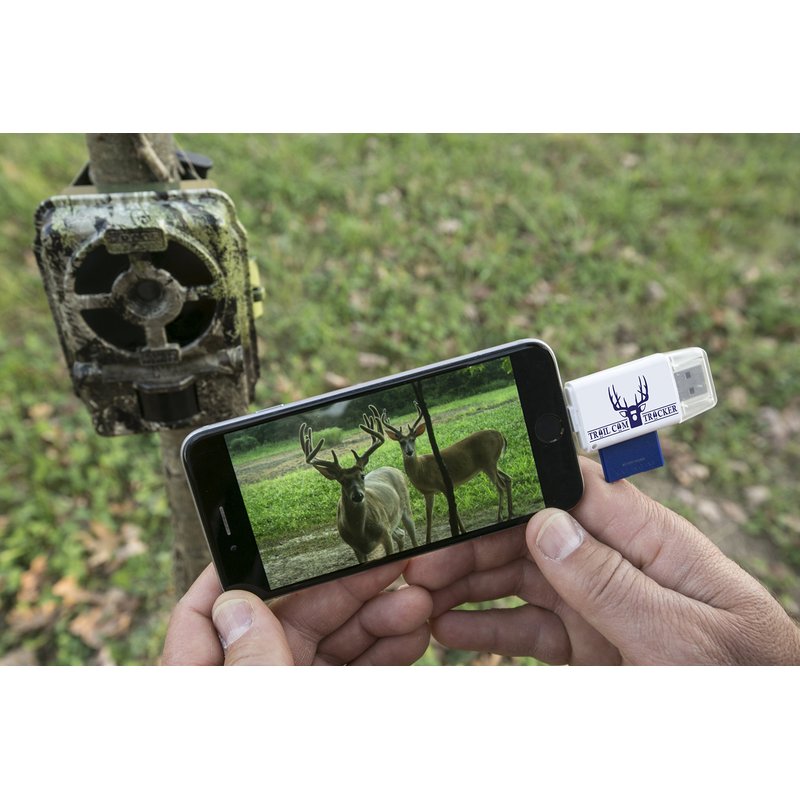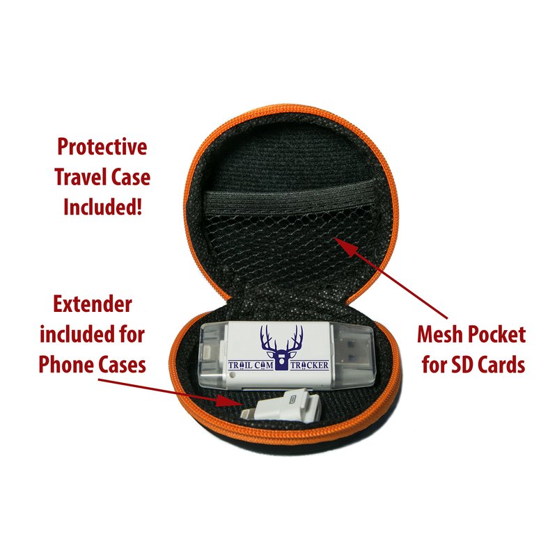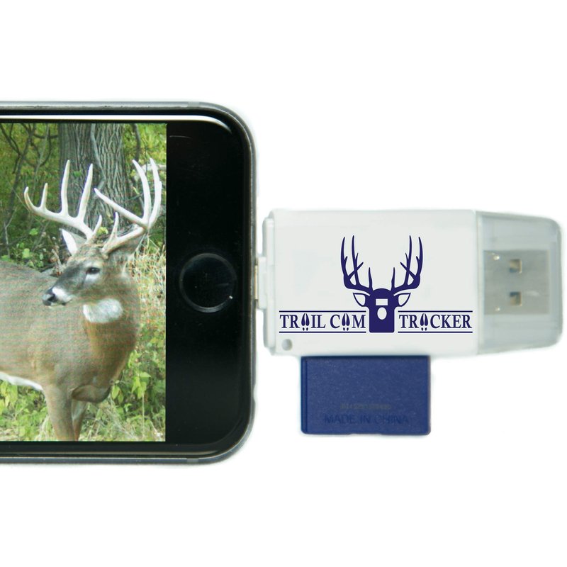 The Trail Cam Tracker trail camera SD card reader is the most REVOLUTIONARY product in the hunting industry since the trail camera itself. This MUST-HAVE trail camera card reader allows you to VIEW, ZOOM, SAVE, SHARE, OR DELETE game camera photos and videos while in the field! Check your trail camera while you are in your tree stand or hunting blind! SERIOUS HUNTERS WITH TRAIL CAMERAS AND A CELL PHONE MUST HAVE THIS PRODUCT. Simply insert trail camera card and reader into your phone charging port to view your photos! HOW IT WORKS: Visit App Store & download the EASY to use and FREE “i-FlashDevice” app for iPhone OR “QuickPic Gallery” for Android Micro USB connection. Insert SD card and the Trail Cam Tracker card reader into your phone to View, Zoom, Save, Share, or Delete Pictures or Videos within the app. FREE PROTECTIVE TRAVEL CASE! FREE LIGHTNING EXTENDER INCLUDED so card reader can be used with iPhone cases. *will not work with LifeProof FRE or NUUD cases for or battery cases. COMPATIBLE WITH ALL APPLE and iPad models with a lightning port connection. iPhone 4 or older models are NOT supported as the they do not have a lightning port connection. COMPATIBLE WITH ANDROID DEVICES containing a MICRO USB slot ONLY. NOT COMPATIBLE with Type C USB connection. Connect to Android phone by extending the micro USB connector from underside of USB port. A fingernail or small screwdriver will help. COMPATIBLE WITH ALL TABLETS AND COMPUTERS WITH USB SLOT. NO APP REQUIRED. IMPORTANT: Reader supports SD cards up to 128GB. Works with ALL trail cameras that use SD cards including Wildgame Innovations, Stealth Cam, Bushnell, Moultrie, Primos, Browning, Cuddeback, Reconyx, Muddy, Spypoint, Covert, & more! 100% SATISFACTION GUARANTEE! Return within 30 days for refund. Trail Cam Tracker offers the BEST customer service! Thanks for supporting our small family business.