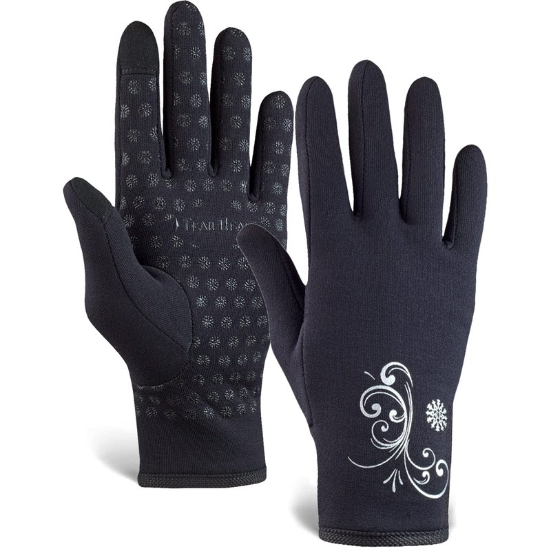- SILICONE PALM GRIPS in a snowflake-shaped pattern enhance dexterity. These women’s running gloves have an attractive metallic swirl print on back of hand.