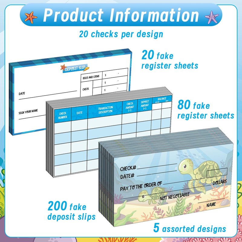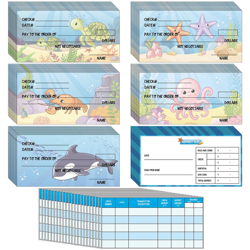 - Extensive Collection Multipack: the package includes 200 fake checkbooks, 80 pretend deposit slip, and 20 fake check register, adopting ocean theme; This comprehensive collection ensures prolonged playtime and a wide variety of game play options; The 200 fake checkbooks contain 5 various underwater animals styles, each style for 40 pieces, vivid and cute