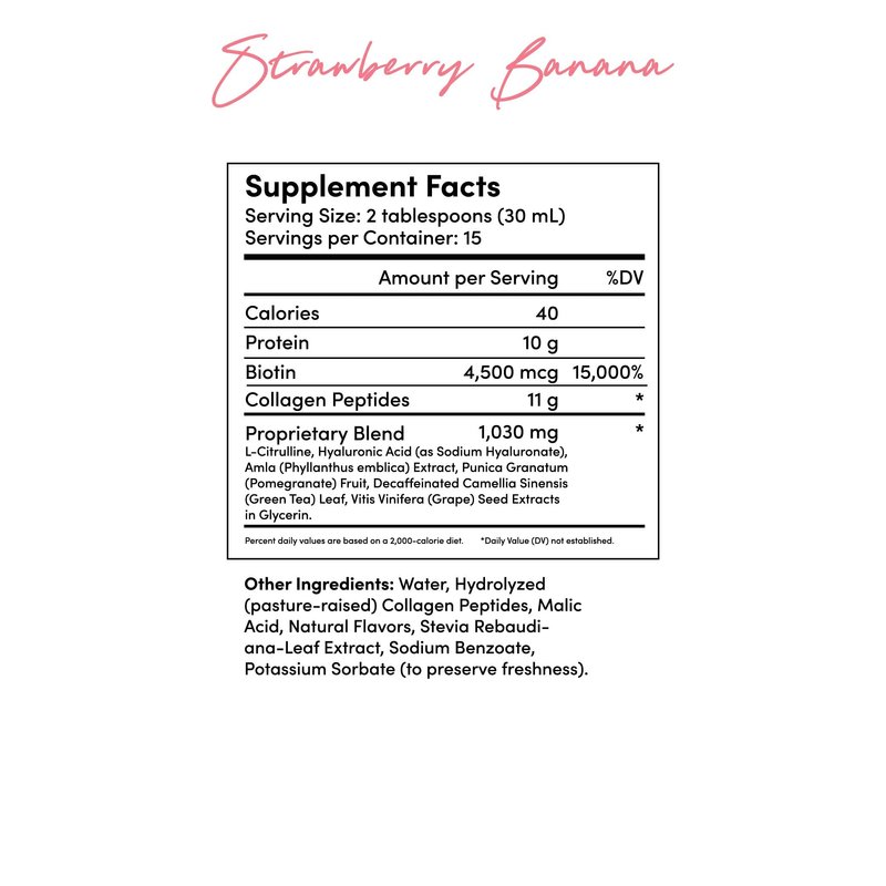 - Type 1 Collagen & Biotin - Our Strawberry Banana liquid collagen is formulated with bioactive collagen peptides & an effective dose of biotin to enhance your natural beauty, skin care, & support hair growth.