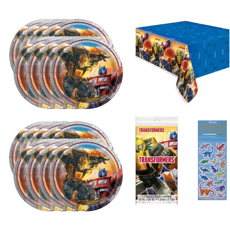 Transformers Party Supplies Bundle Pack includes 16 Dessert Cake Plates, 1 Plastic Table Cover, 1 Esave Dinosaur Sticker Sheet (not Transformers stickers).