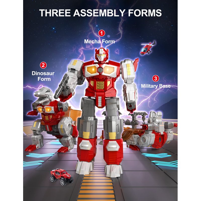 - Three Assembly Forms & One Sound: Remarkable deformation, this toy can be transformed into 3 forms, namely mecha form, dinosaur form, parking runway form (including a small plane and a car); also with cool lighting and sound effects, transforming robots/dinosaurs debut, more fun, let the children explore the secrets of the animal and robot world.