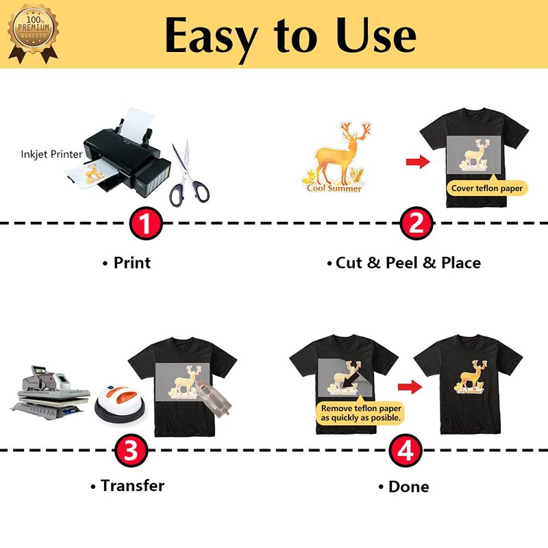 - 💕EASY TO USE: [1] No Mirror Print & Cut out your design. [2] Place the printed image facing UPWARDS onto fabrics and cover the image with teflon sheet (in the pack). [3] Transfer Image with Iron or Heat Press. [4] Remove the teflon paper. Transfer has been done! Step-by-step instructions are on the back of cover paper in the pack.