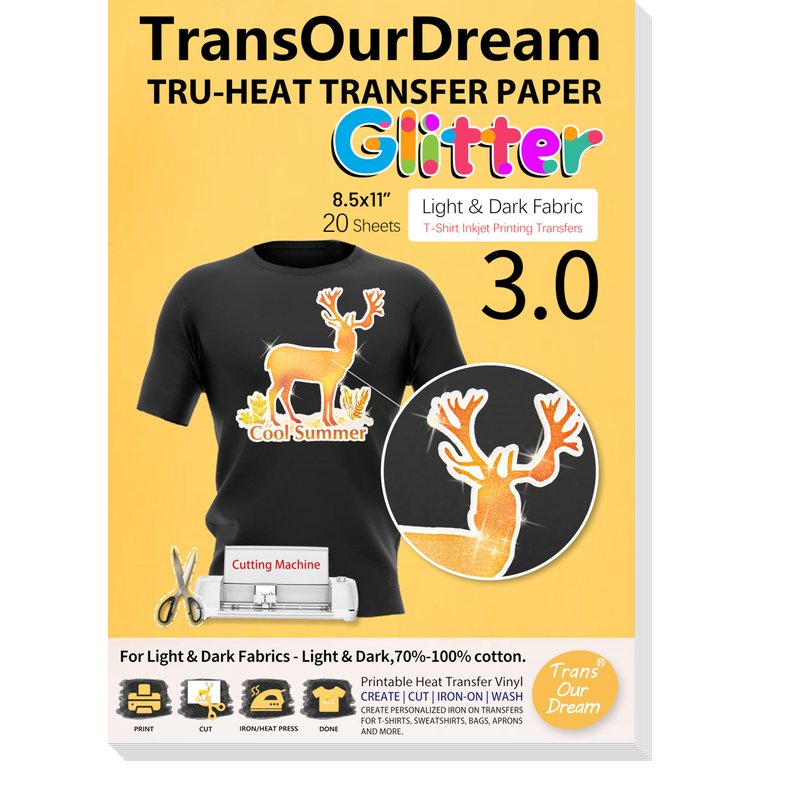 TransOurDream Glitter 3.0 Heat Transfer Paper for Inkjet Printer (20 Sheets, 8.5x11'') Printable Heat Transfer Vinyl for T Shirts Iron on Transfers for Light & Dark Fabric (TOD-GL3-20)