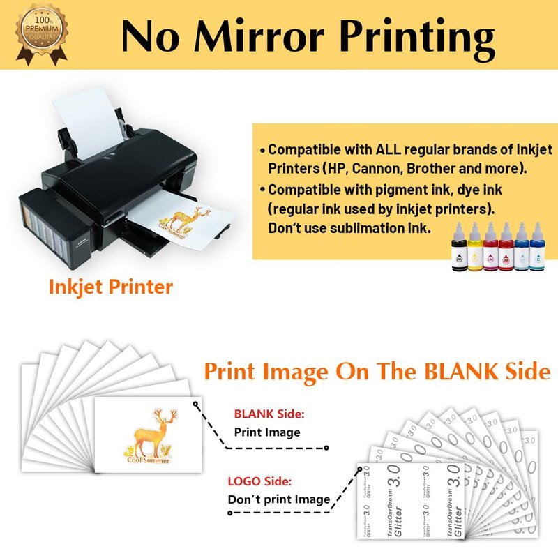 - 💕TRU-GLITTER TRANSFER PAPER: Pack of 20 sheets Glitter 3.0 Heat Transfer Paper and 2 sheets reusable Teflon Paper. This printable Glitter Heat Transfer Vinyl presents better vibrant sparkle effect after washing (48 hours after transfer). Easy to be cut with Scissors & Cutting Machine and compatible with various INKJET printers. Extremely machine wash durable.