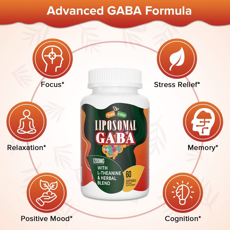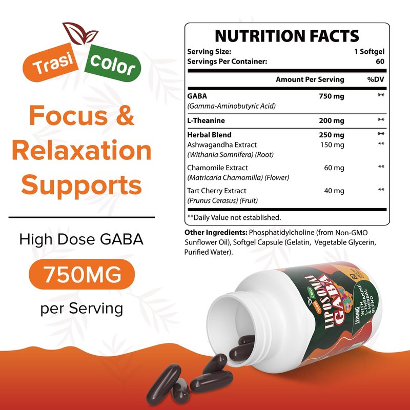 Trasicolor Liposomal GABA with L-Theanine Supplements 1200mg - High Absorption GABA Complex with Ashwagandha, Chamomile, Tart Cherry Herbal Supplements for Men and Women, 60 Softgels