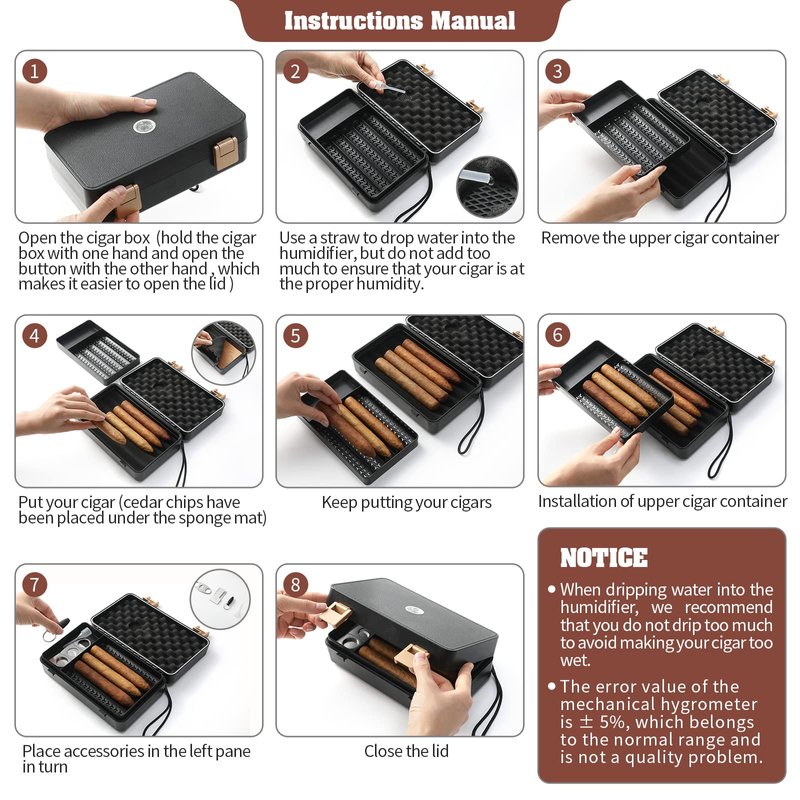 - With rich and beautiful accessories:A stainless steel cigar cutter, a stainless steel cigar holder, and a mobile cigar puncher are very suitable for travel. The travel cigar box is equipped with Spanish cedar paper, which can purify your cigar and make it more fragrant