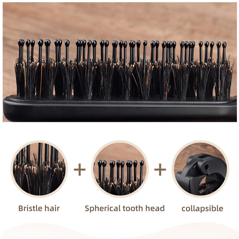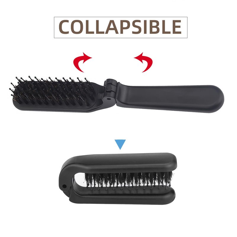 Travel Folding Hair Brush, Collapsable Pocket Portable Beard Hairbrush, Mini Boar Bristle Hair Brush for Thin Thick Dry Wet Curly Straight Hair, Women Men Hair Styling Tool (Black)