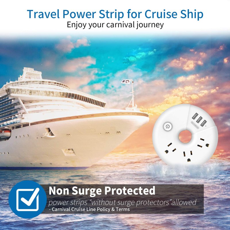 - 【 Portable Power Strip for Travel & Cruise Ships 】 Travel power strip is in perfect size(4.5*4.5*1 in) that fits right in the palm of your hand. Compact and lightweight design won’t take up much space in a bag or weigh you down. Power Strip No Surge Protector - To be Fully Cruise Compaliant, ideal for travel and cruise ships. Travel extension cord with usb ports also fits nicely on your desk, nightstand or dresser at home, and cleans up all the cord chaos.