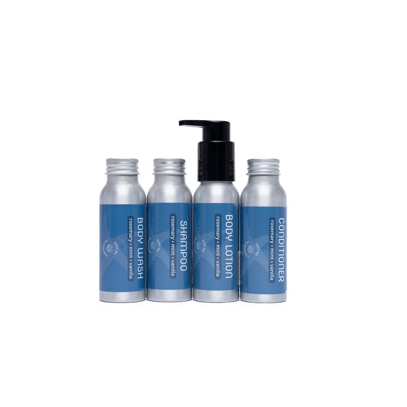 - Includes 2.5 oz of shampoo, 2.5 oz of conditioner, 2.5 oz body wash, 2.5 oz body lotion. Bottles can be refilled with our 16oz products.