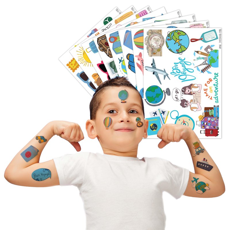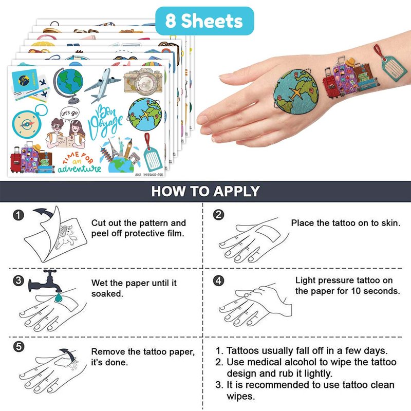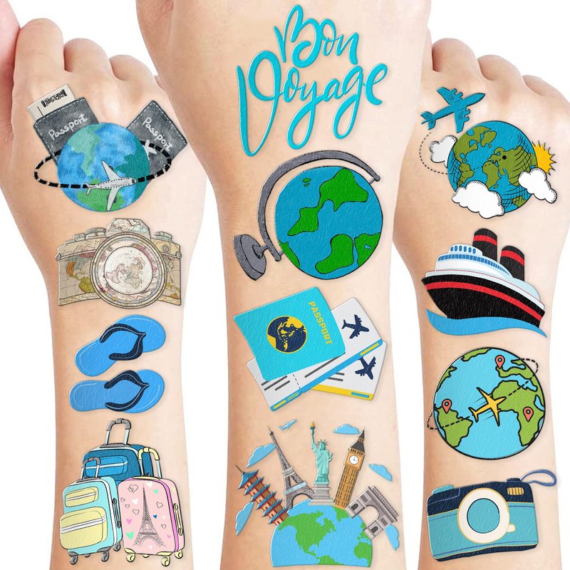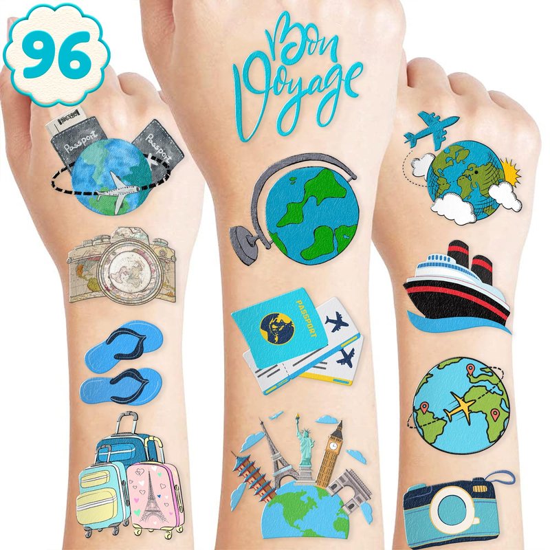 - ✈️【IDEAL TATTOOS FOR THEMED TRAVEL DECOR】: This set of temporary TRAVEL-themed tattoo stickers comprises 8 sheets in total, featuring a total of 96PCS adorable, distinct designs. They are excellent for distributing as party favors and small gifts with a TRAVEL, Bon Voyage, Adventure theme for holidays. Each sheet measures 6.1 * 3.1 inches, making them suitable for kids of all sizes.