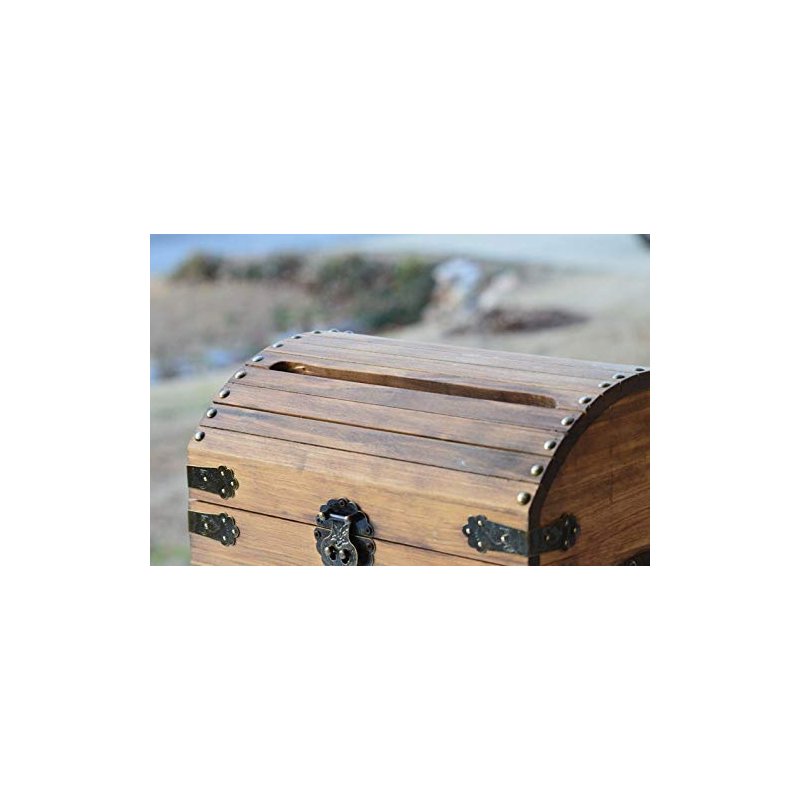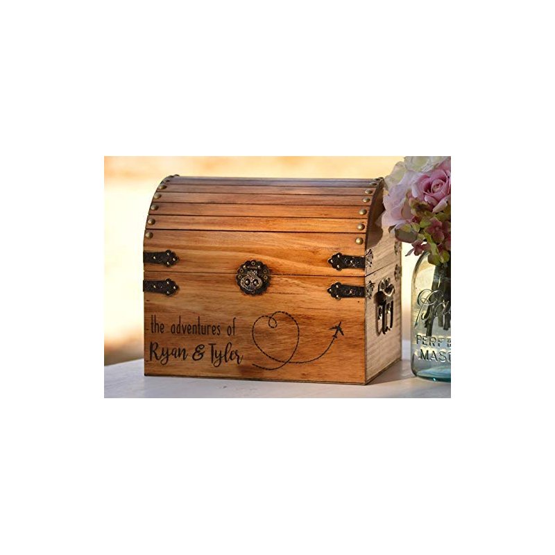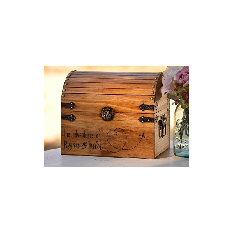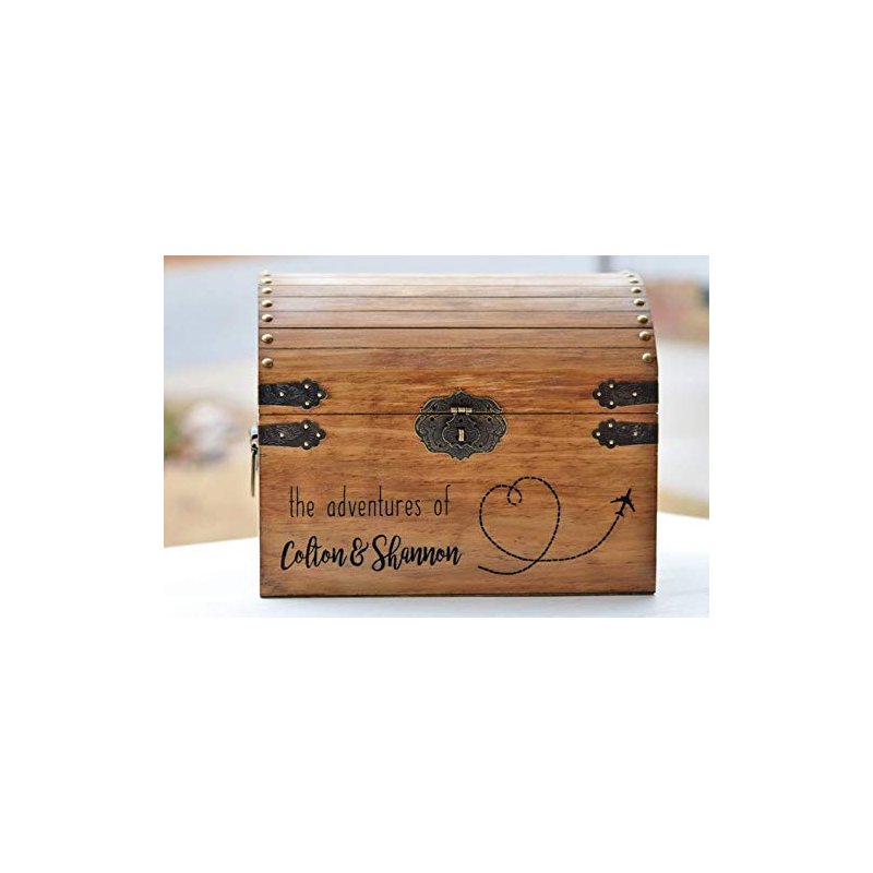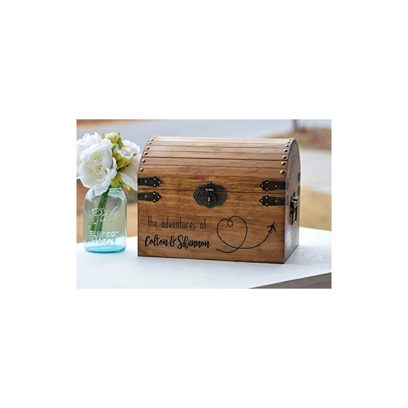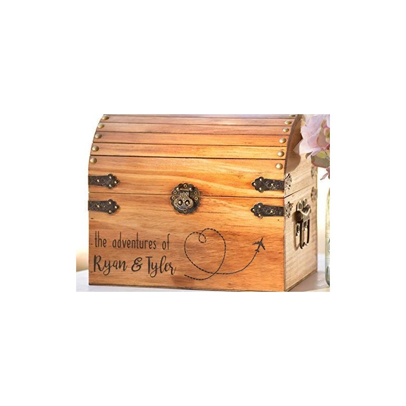 This travel wedding card box with lock option features your names laser engraved on the front with the design shown. It creates a fun addition to your gifts table that is sure to impress!