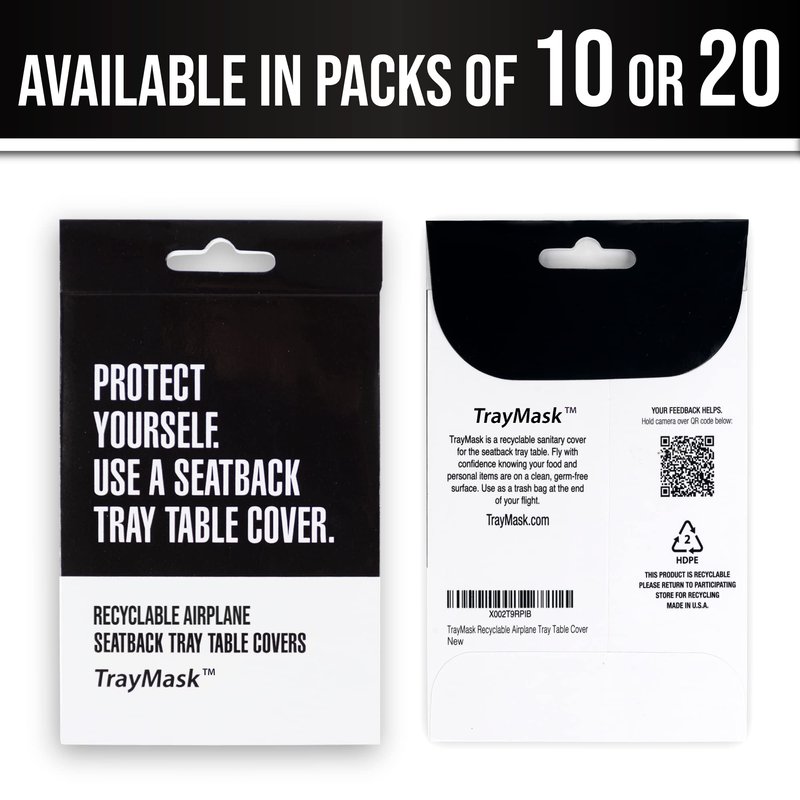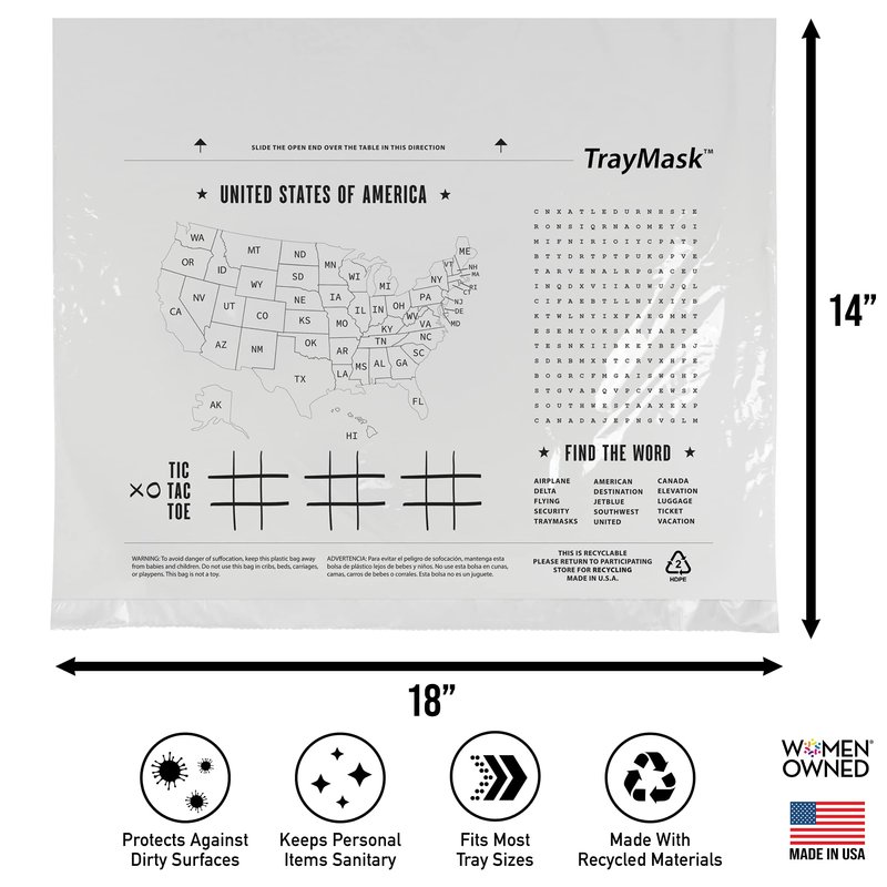 TrayMasks are designed to give passengers comfort knowing that their food and personal items have an extra layer of sanitary protection. TrayMask reduces interaction with dirty surfaces on one of the most touched places on an airplane, train, or bus...the tray table. The simple design allows passengers to slide the open edge of the cover over the seatback table. Always have a clean surface to eat and work on. Product details: 18” wide x 14” long (Average airplane tray tables are 16.5” x 10.5”) Fits on all coach/economy seatback tray tables Fits on most first-class fold-out tables Fits on bus and train tables Made of 20% HDPE #2 recyclable plastic Where they can be used: Airplane Train Bus Car RV How can the TrayMasks be used: Keep tray table area clean For snacks and drinks To keep laptop, food, and personal items clean Play tic-tac-toe or Word Finder games Enjoy USA map trivia Use as a garbage bag when the trip is over Each TrayMask is made of 20% recycled materials.
