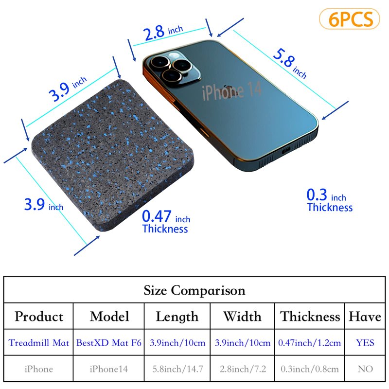 Treadmill mat is designed to protect your hardwood floors and carpet from damage and scratches effects Place Exercise Equipment Mat under each leg or foot of exercise equipment to protect carpet and floors, Treadmill Mat can Absorbs vibration anti-slip caused by all sorts of equipment while prolong the life of your Treadmill Treadmill Mat is strong and durable, the unique punching design can effectively increase friction, reduce vibration Treadmill Mat is made by High density Rubber ,One PCS Mat Weight is 0.3lbs, Heavily weight capacity up to 1000 lbs,Size 3.94 X 3.94 X 0.5 inch Small pieces of design to save your space and fit different types of equipment perfectly. You can get Exercise Equipment Mat (3.94 X 3.94 X 0.5 inch, 6 pcs ) and life time Warranty. Customer satisfaction is our highest priority