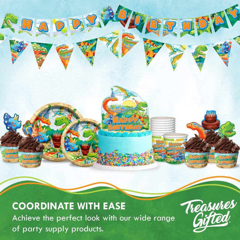 - Get more dinosaur theme party decorations and other party decorations! Check out the Treasures Gifted Amazon store for more products such as dinosaur party plates, dino cups, t-rex balloons, and other dinosaur birthday party supplies!