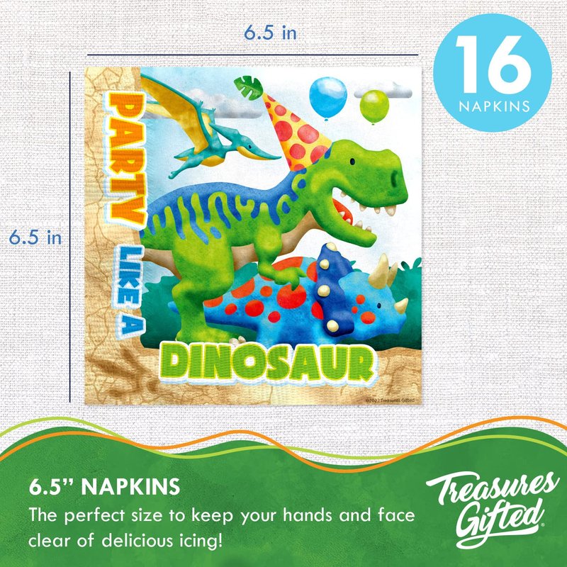 Treasures Gifted Boy Dinosaur Napkins 6.5 Inch - Pack of 16 Dinosaur Dinner Napkins for Kids - Dinosaur Party Decorations - Dinosaur Birthday Party Supplies - Dinosaur Party Supplies