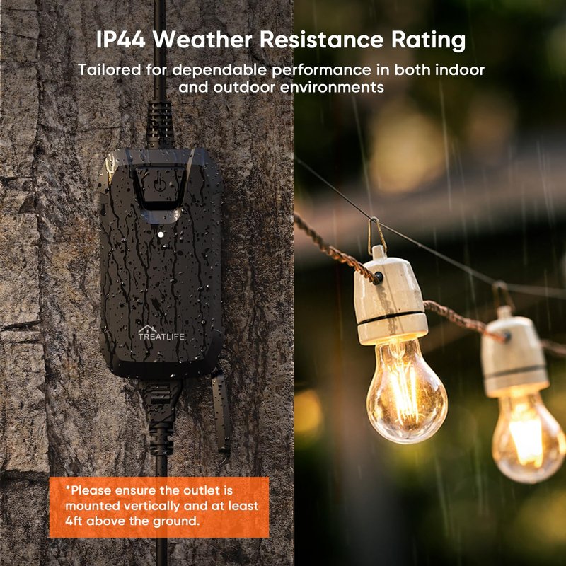 - IP44 Weatherproof Rating: Crafted with V0 grade fireproof material, a robust PC shell structure, and internal silicone filling for efficient heat dissipation, this outdoor plug with remote boasts superior waterproofing capabilities. Whether for indoor or outdoor use, it excels in enduring wear, humidity, cold, and sunlight.