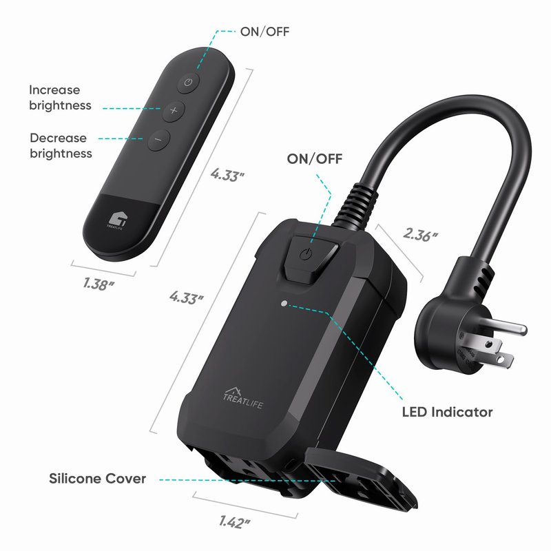 Elevate your outdoor lighting experience with the Treatlife outdoor dimmer plug. Seamlessly control dimmable light bulbs, supporting up to 400W, through its wireless remote. This versatile dimmer for outdoor string lights is designed to enhance a variety of outdoor settings, from table and floor lamps to outdoor lighting, Christmas decorations, pool equipment, and bedside lamps. With its IP44 waterproof rating, our dimmer plug for lamp guarantees safety and reliability even in wet conditions. It's as easy as plugging in the device, and you can effortlessly manage your outdoor lighting from up to 100 feet away using the included remote control. Elevate your outdoor ambiance with the Treatlife dimmer switch plug today.