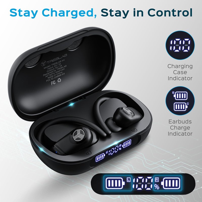 TREBLAB X4 Wireless Earbuds with Earhooks – 253H Battery, ENC Mic, Bluetooth 5.4, USB-C Charging Case, IPX5 Waterproof, Noise Isolating, for Running, Calls, Workouts – Bluetooth Over Ear Earbuds