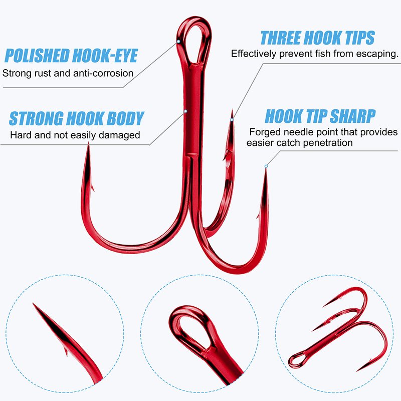 - Sharp: Treble hooks with triple super sharp needlepoint with barb, force fish into elbow and prevent fish from escaping.