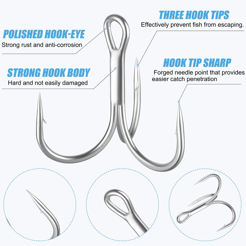 - Sharp: Treble hooks with triple super sharp needlepoint with barb, force fish into elbow and prevent fish from escaping.