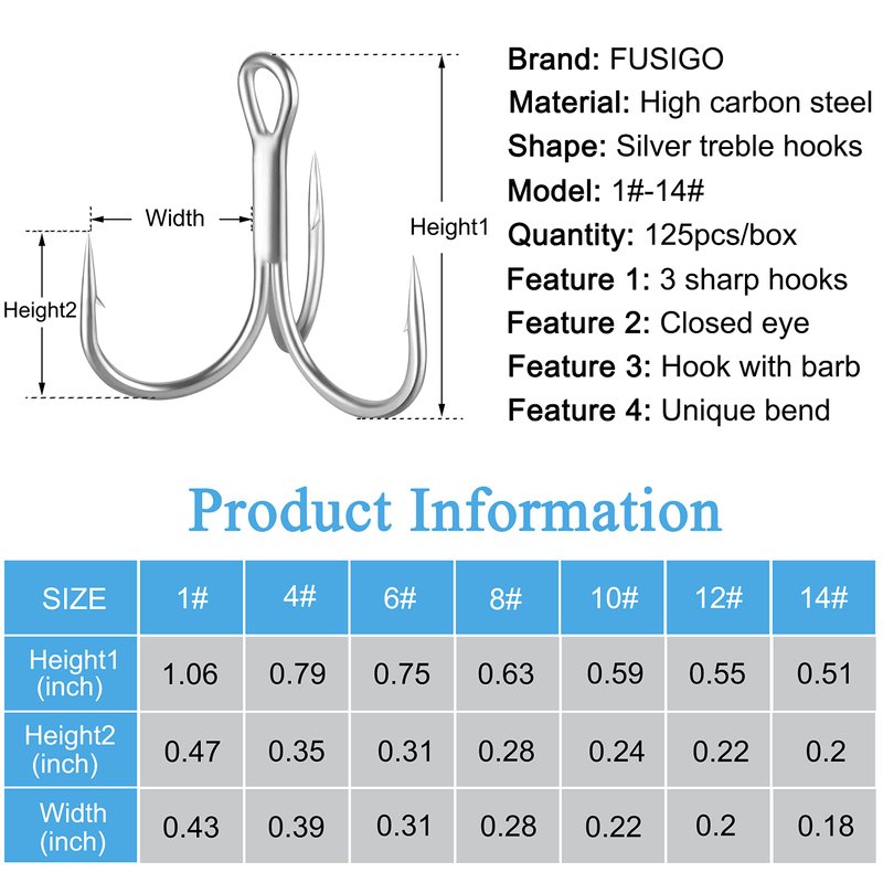 - Strength: Treble hooks are made from high carbon steel with nickle coating, anti-rust and ultra strength.