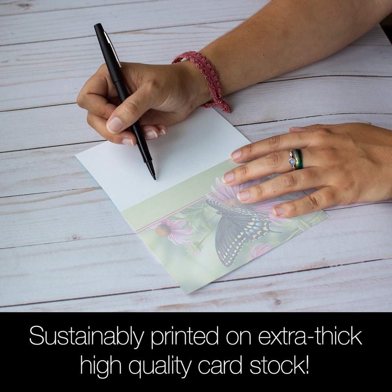- SUSTAINABLY MADE IN USA - Ecologically printed in the USA. Card and envelope are made from 100% post consumer recycled paper. Printed using 20% less waste than conventional printing, using 100% solar power.