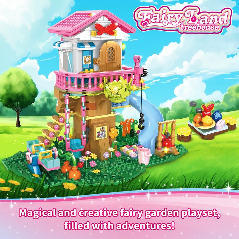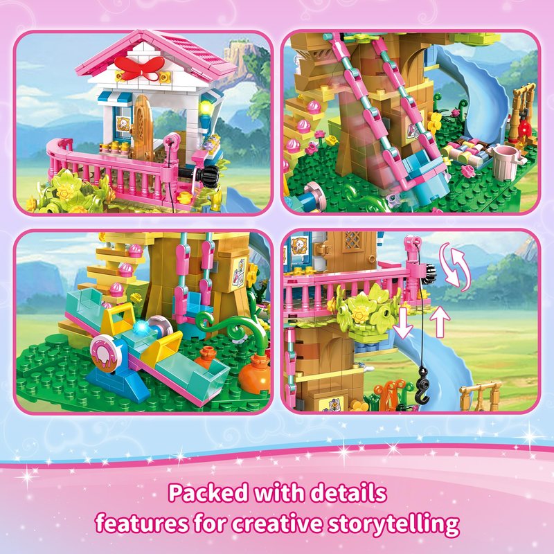 - Magical Forest Tree House Building Playset – Inspired by fairy tales, this beautiful collection of treehouse architecture features creative structures and exquisite details with individual rooms, animal nests and a wealth of detailed play and growing areas such as fun slides, seesaws, zipline and swings. A total of 6 cute little animals also add more vitality to this forest tree house. The fairy tale tree house garden, full of adventure fun!