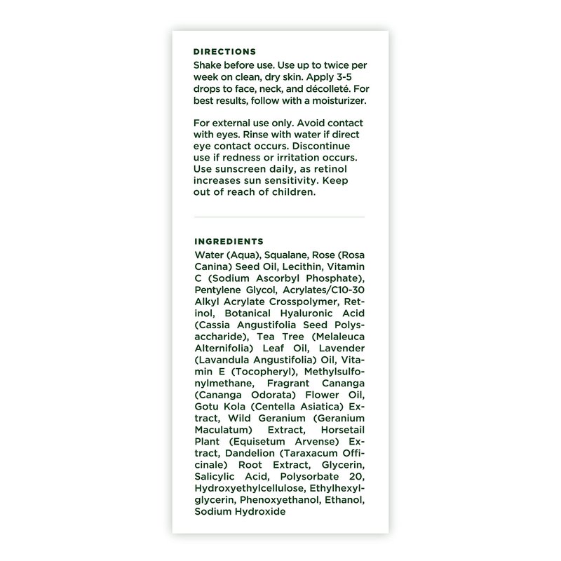 - Directions: Use up to twice per week on clean, dry skin. Apply 3-5 drops to face, neck, and décolleté. For best results, follow with a moisturizer.