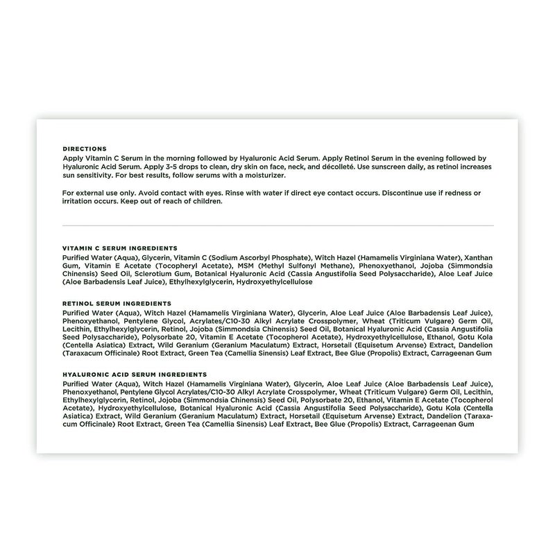- POWERFUL ANTI-AGING TRIO: This set includes our beloved Vitamin C Serum to brighten and even skin tone, Retinol Serum to reduce fine lines and wrinkles, and Hyaluronic Acid Serum for deep hydration. Used together, these potent serums visibly improve skin texture, tone, and firmness for a more youthful complexion. Suitable for all skin types including sensitive skin. See noticeable results in as little as 2-4 weeks with consistent use.
