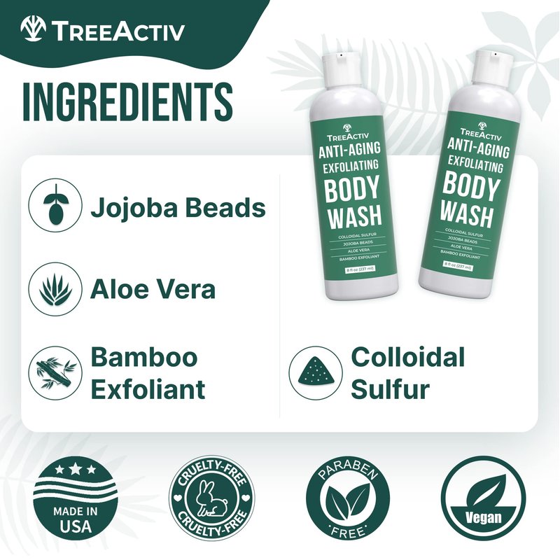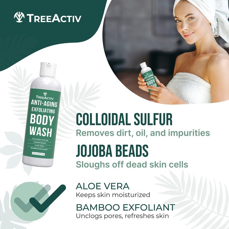 TreeActiv Anti-Aging Exfoliating Body Wash, 8oz, All Natural Body Wash Women and Men, Exfoliating Body scrub Infused with Jojoba Beads, Sulfur, and Aloe Vera - Shower Gel For All Skin Types - 50 Uses