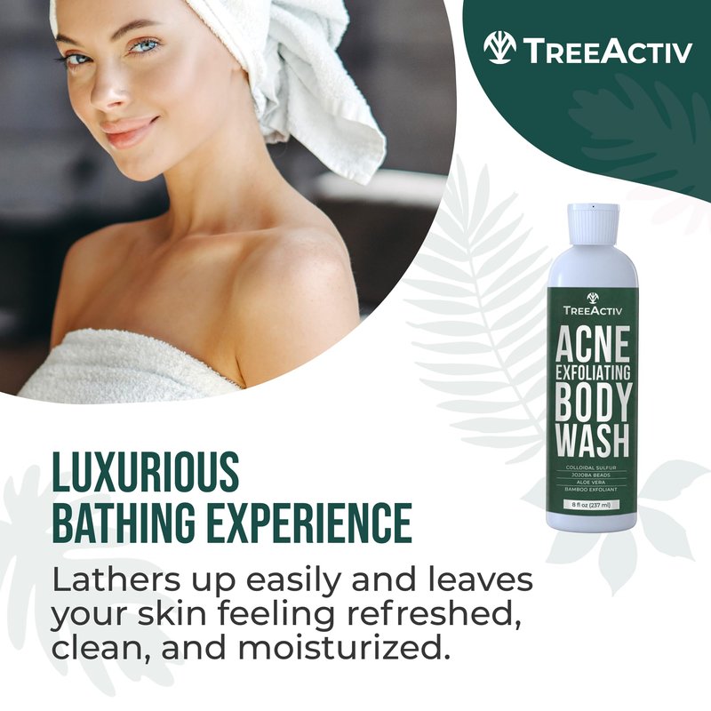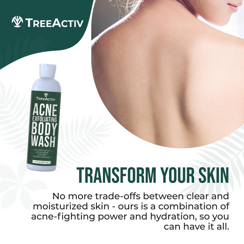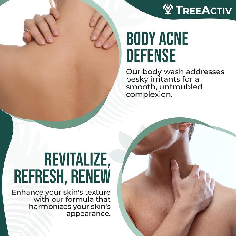 TreeActiv a complete acne back treatment in a bottle. Our acne wash for dry skin, cystic acne wash, body wash for acne back and chest, clarifying acne body wash, butt acne body wash and body clear acne body wash is designed to combat back acne and for those struggling with stubborn bacne. With its clarifying properties, our back acne treatment wash ensures that no pimples go unnoticed.