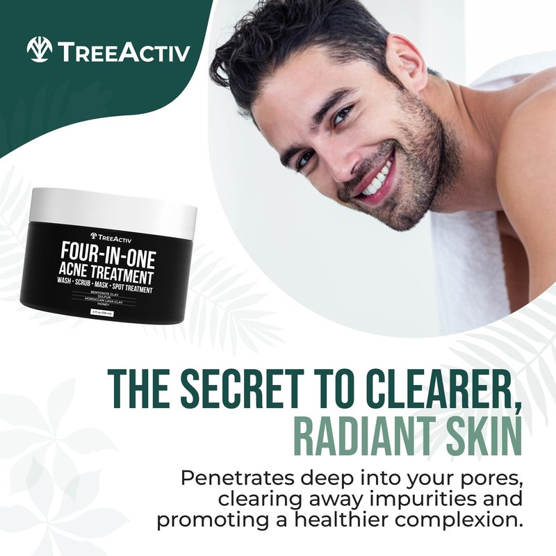 The TreeActiv Four-in-One Acne Treatment that works as a blackhead facial scrub and exfoliating acne wash is a premium face scrub for acne prone skin that is designed to lessen acne and blackheads. This acne facial scrub, with a combination of nature-powered ingredients like bentonite clay, aloe vera, grapefruit essential oil, and witch hazel, may help you achieve smoother, clearer, and more radiant skin.