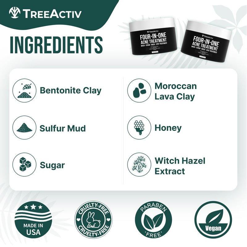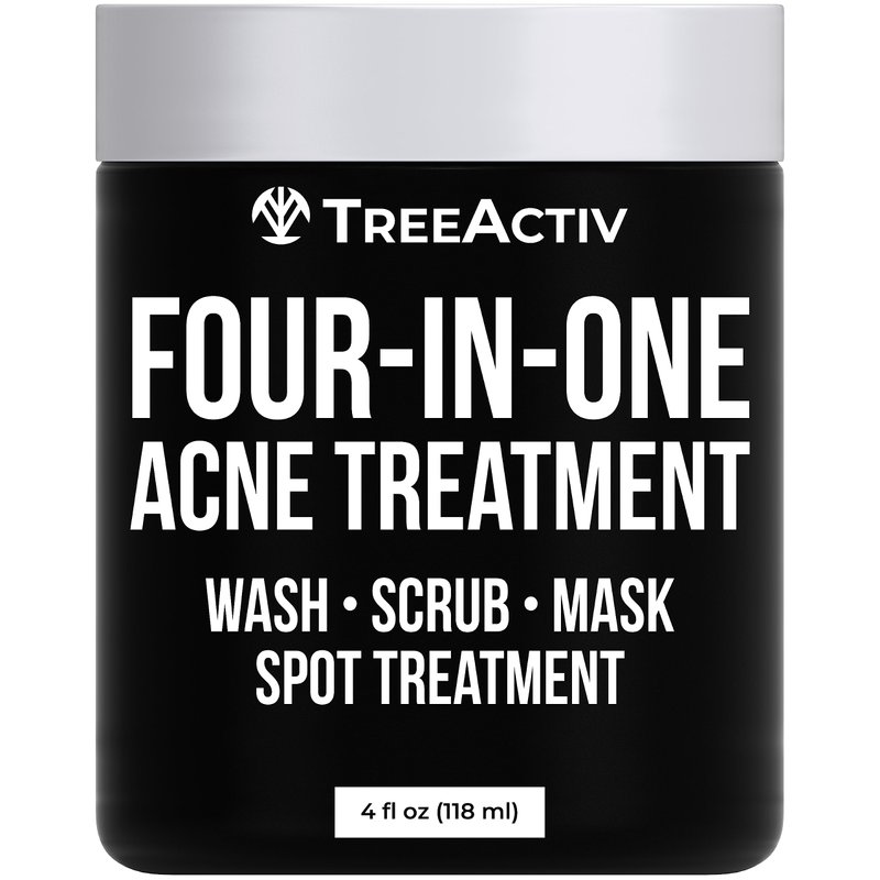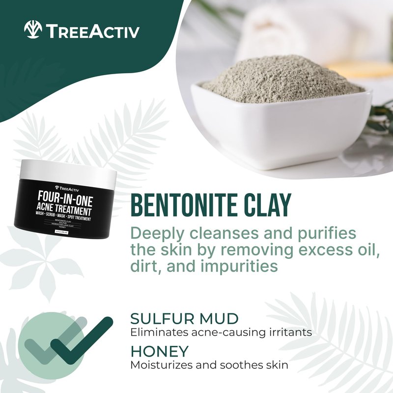 TreeActiv Four-in-One Acne Treatment, Exfoliating Sulfur Acne Face Wash, Bentonite Clay Face Mask & Acne Spot Treatment, Pore Clarifying Facial Scrub for Adult, Teens, Women, & Men, 250+ Treatments