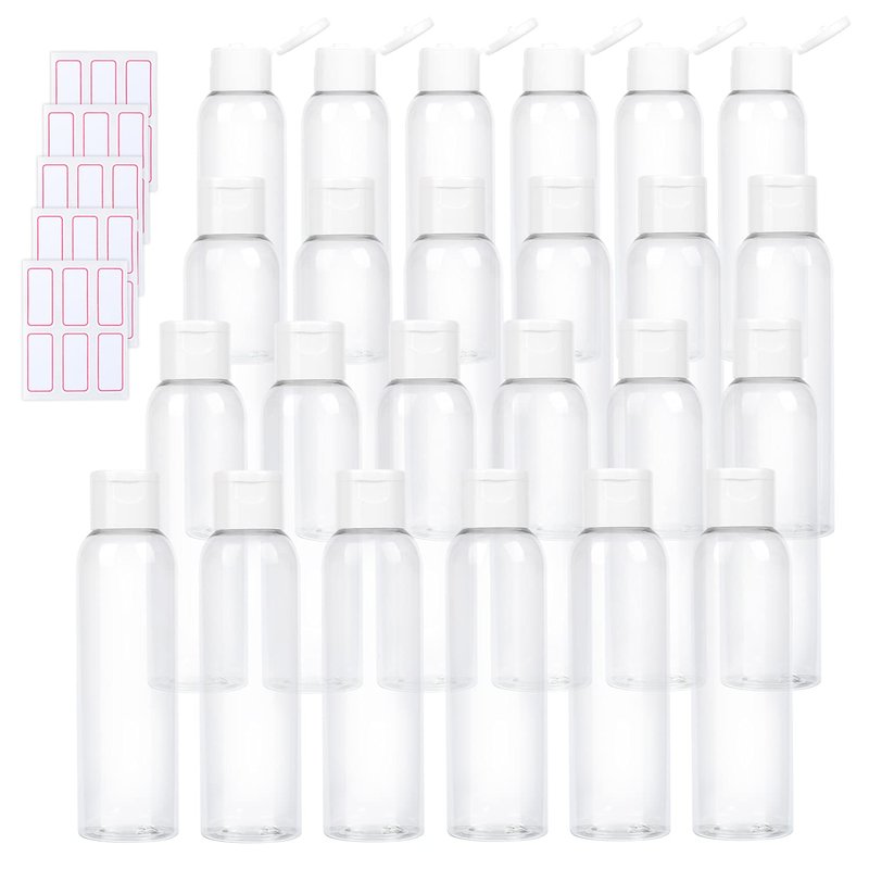 - Set of 24 empty PET plastic bottles with screw-on, flip-cap tops.