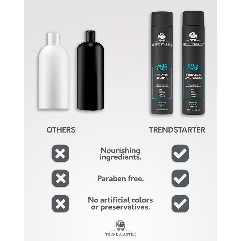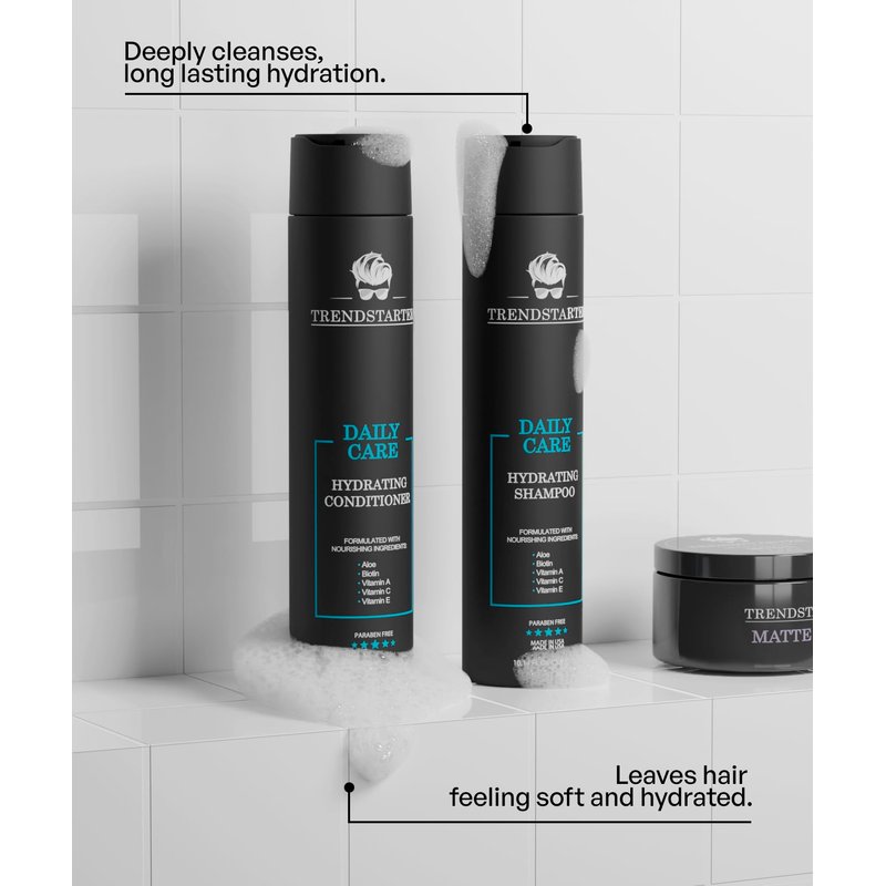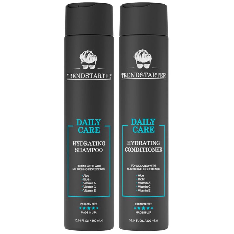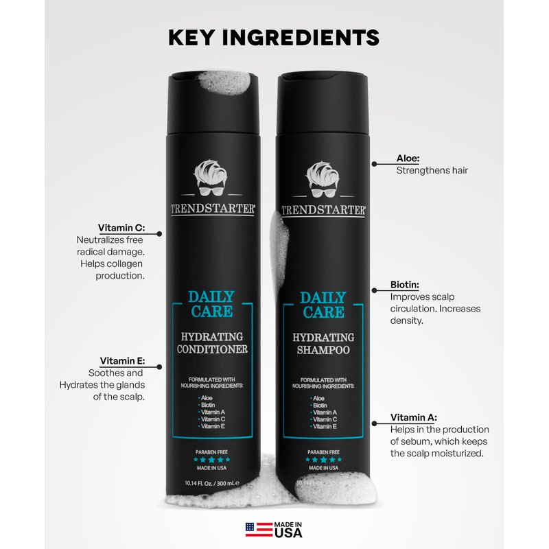 TRENDSTARTER DAILY CARE HYDRATING SHAMPOO & HYDRATING CONDITIONER Set (10.14 Fl.Oz ea.) Made with Aloe, Vitamin A, Vitamin C, and Vitamin E for Healthy Hair and Healthy Scalp Launched 2023. PREMIUM INGREDIENTS Carefully crafted using the best quality nourishing ingredients, TRENDSTARTER Daily Care Hydrating Shampoo and Conditioner is made with Aloe, Biotin, Vitamin A, Vitamin C, & Vitamin E to improve hair texture, strength, volume. PARABEN & CRUELTY FREE Never tested on Animals. Free of parabens and harsh chemicals. MADE IN THE USA All of TRENDSTARTER products are proudly made in the USA.