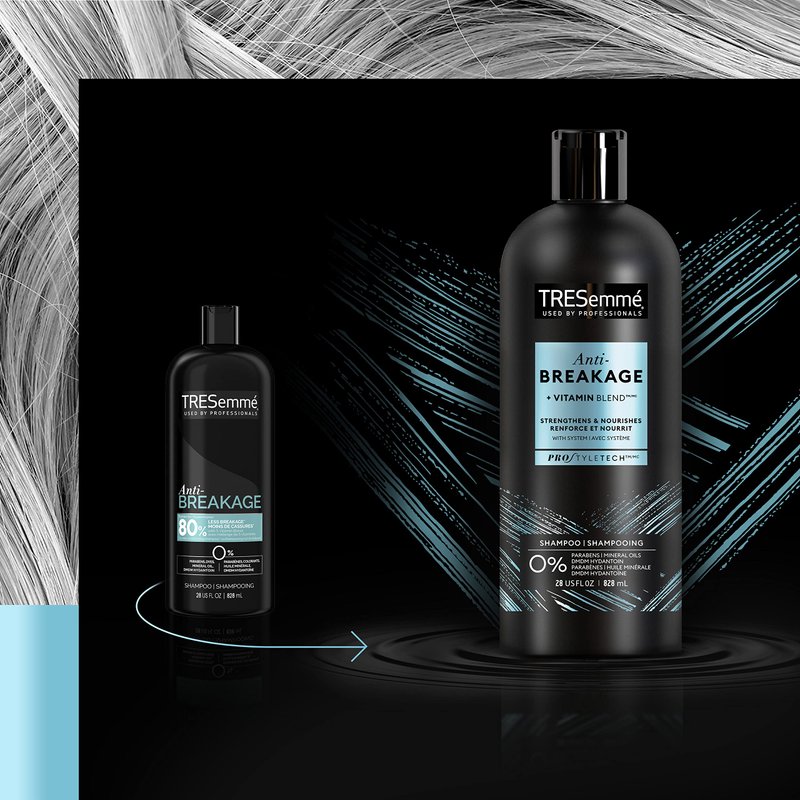 - ANTI-BREAKAGE SYSTEM; TRESemmé Anti-Breakage Shampoo and Conditioner system strengthens hair by targeting the most damaged areas to leave hair strong and healthy-looking