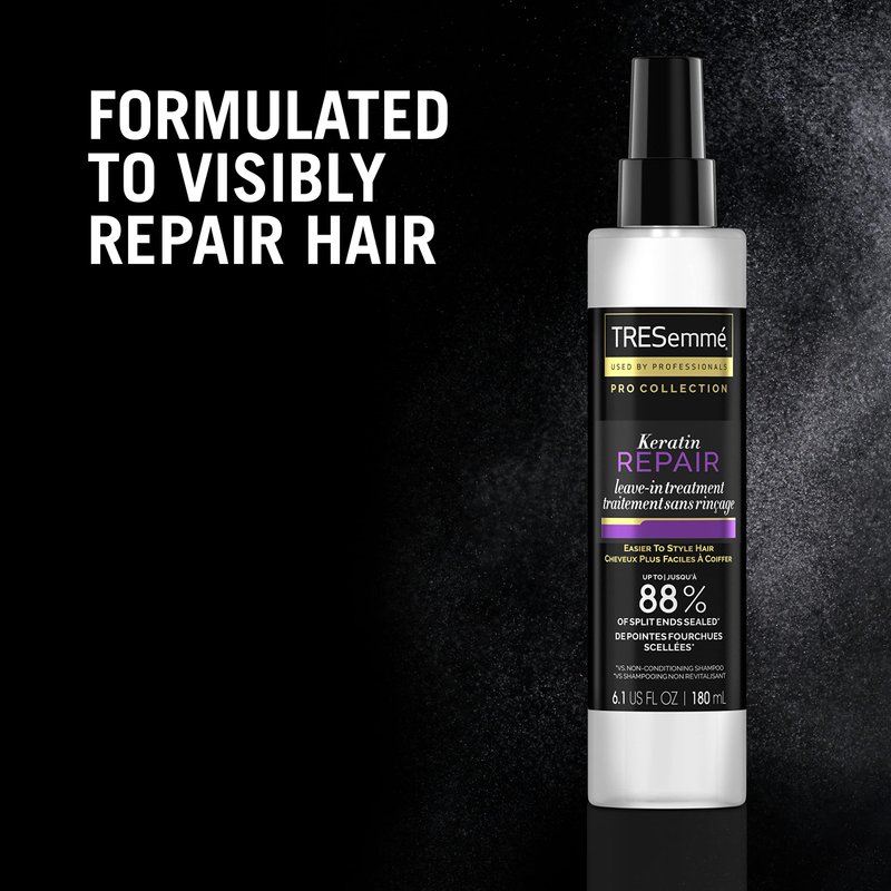 - KERATIN HAIR TREATMENT REPAIRS SPLIT ENDS: TRESemme Keratin Repair Leave in Conditioner Spray helps to visibly repair hair by sealing up to 88% of split ends (vs. a non-conditioning shampoo).