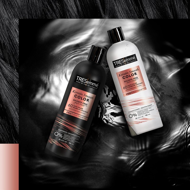 - KERATIN SMOOTH COLOR SYSTEM. TRESemmé Keratin Smooth Color Shampoo, with Anti-Fade, prolongs and maximizes the time between coloring, leaving hair radiant and glossy for up to 60 days