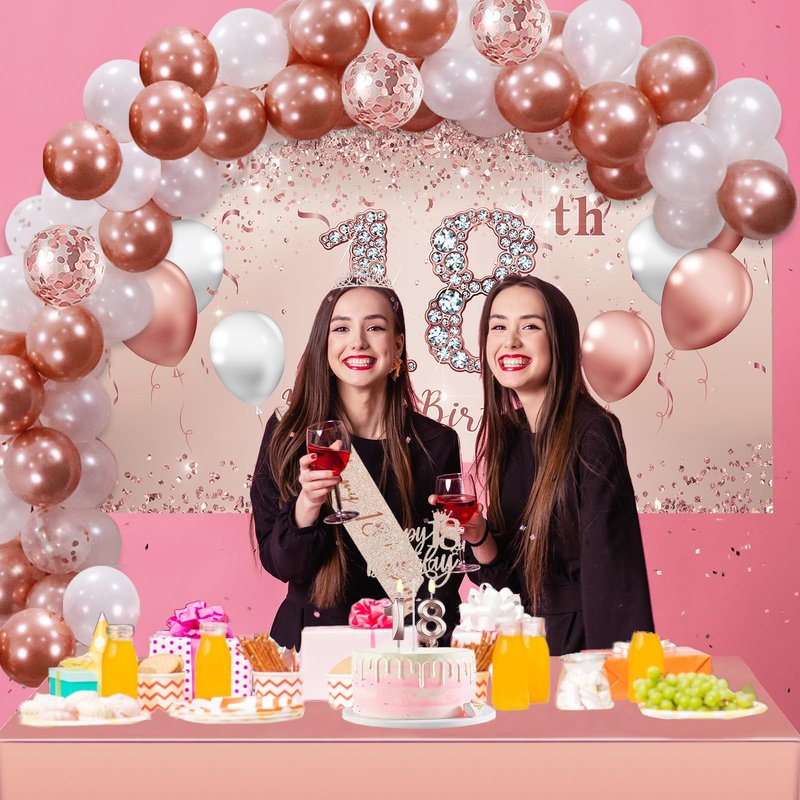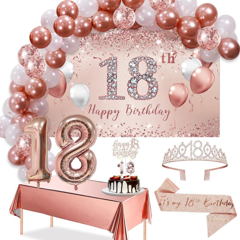 Trgowaul 18th Birthday Decoration Set. It's big enough to hold your birthday party. What will you get: 1 rose gold background banner 70.8 x 43.3 inches, 1 rope. 1 x 18th birthday crown, 1 x 18th birthday belt, 1 x pearl pin, 1 piece of 18th birthday happy cake topper, size 18 balloon 32 inches, 1 rose gold tablecloth, and 60 latex balloons. Please note: 1. The color correction for each computer may vary, and subtle color differences are common. 2. At the same time, due to different batches of background materials or pattern ink, there may be slight differences in the background during printing. 3. The background pattern is high-quality digital printed. 4. Folding packaging: The packaging is folded and may have creases. If you are worried about creases, you can use a low heat steam iron to iron the back, or use a long tube to roll it up for about 3-4 days. Do not use a dry iron. How to hang up? There is a hole in every corner of our birthday background. So you can use the ropes we sent to string the holes together and hang them where you want to hang them. Alternatively, you can use clips, tape, or thumbnails to hang the background on the wall.