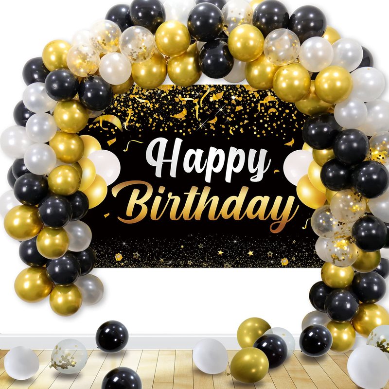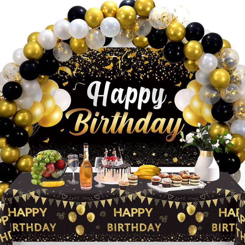 Features: Suitable for: This happy birthday set will adding a impressive beauty to the anniversary birthday party,adding an impressive beauty to the grand birthday party, which is an essential decoration to create memorable happy birthday party atmosphere. Easy to Use: 1. 【Birthday Backdrop】 Use the grommet holes on the four corners of the birthday banner and hang it with a rope. 2. 【Rectangular Birthday Tablecloth】 The size of the birthday tablecloth is 54 x 108 inches / 137 x 274 cm. It is suitable for an 8-foot long table and can accommodate 8-10 people. It is enough to accommodate supplies for the birthday party. 3. 【Balloon Arches and garland】The use of balloon glue and balloon chain can help you make the arch easier and faster, saving time and energy; Package includes: 1 x Black Gold Backdrop (70.8 x 43.3 inches,polyester fabric) 2 x Rectangular Birthday Tablecloth(108 x 54 inches,PE) 16 x Black Balloons 16 x Gold Balloons 14 x White Balloons 14 x Gold Confetti Balloons 1 Roll of Balloon Glue 1 Roll of Balloon Chain 1 Roll of Backdrop Ribbon Note: 1.Please allow slight deviation due to manual measurement. 2.Please allow slight color difference due to different monitors. 3.For confetti balloons, after inflating, please rub and roll the balloon lightly with a towel, wool, carpet, or cloth to make the balloon static so that the confetti sticks to the balloon. 4.The thickness of latex balloon is higher than the market average. We strongly recommend using electric pump or manual pump to inflate the balloon. 5.Winding risk may exist, please keep them away from boys and girls who are under the age of 3.