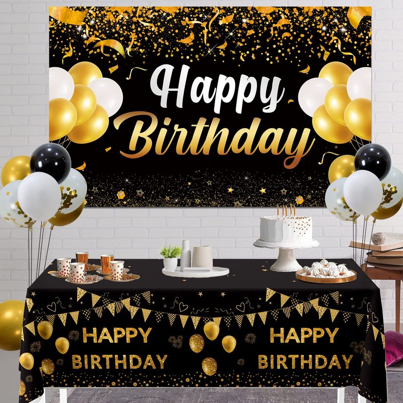 - 【What You Get】The birthday party balloon set contains - 1 pc black and gold birthday backdrop banner (70.8 x 43.3 inches), 2 pcs rectangular tablecloth with "Happy Birthday" (54 x 108 inches), 60 pcs 12 inch balloons (black * 16, gold * 16, white * 14, golden confetti* 14)