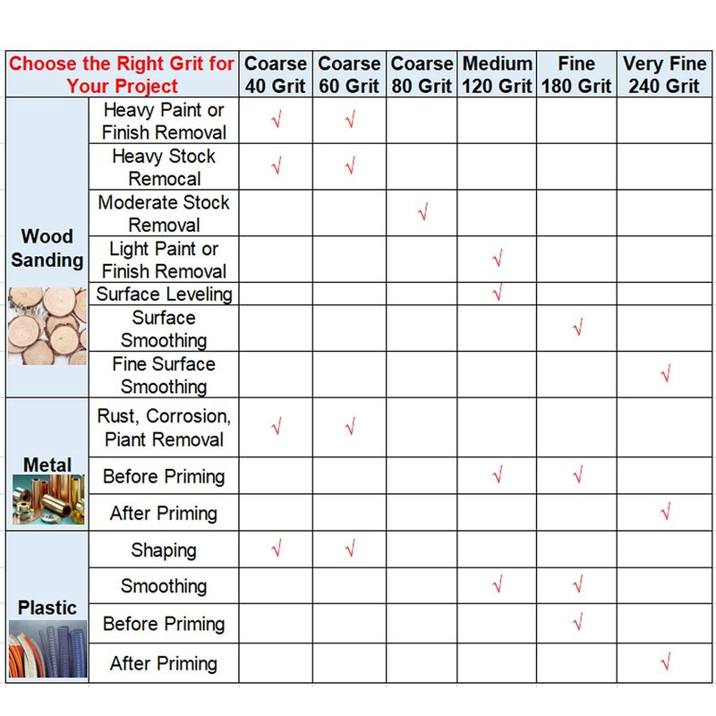 - Perfect for wood sanding: 40/ 60 / 80 grit for rough wood, 120/180 grit for general wood, 241 grit for final finishing of wood, metal, plaster, and other materials.